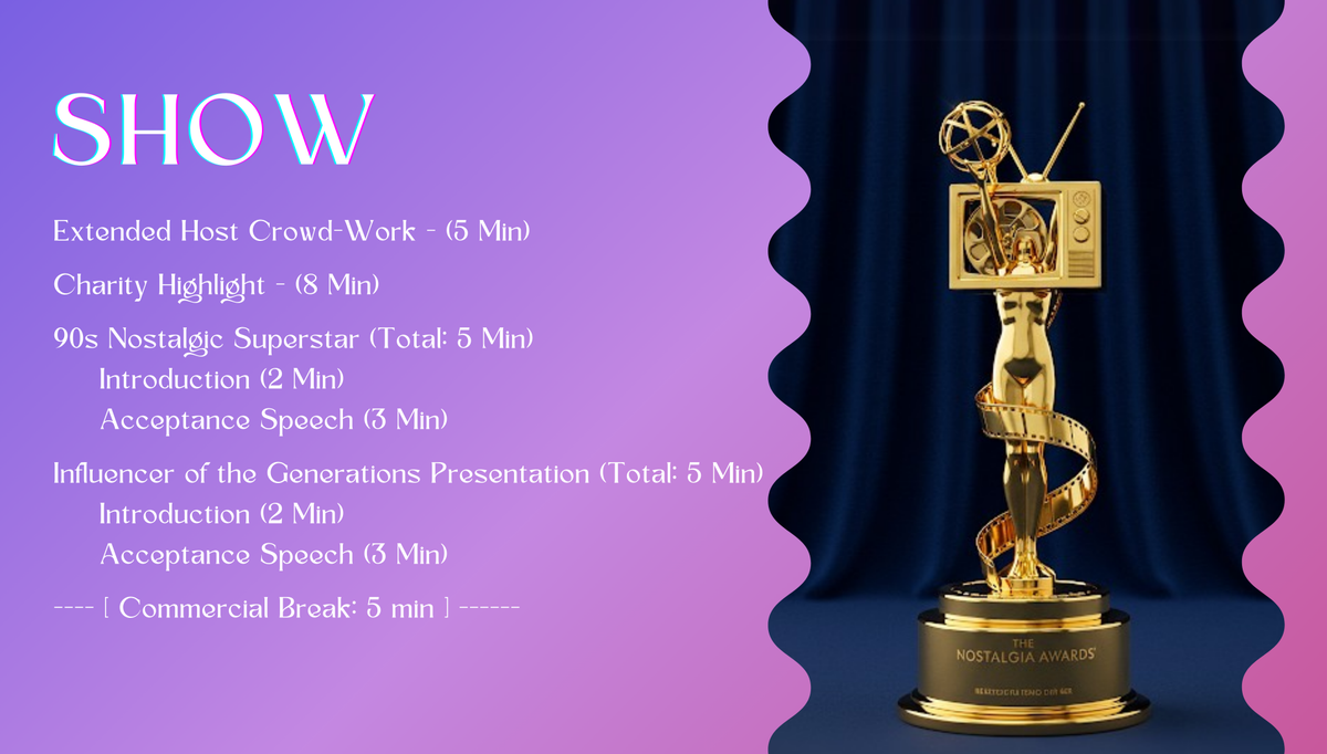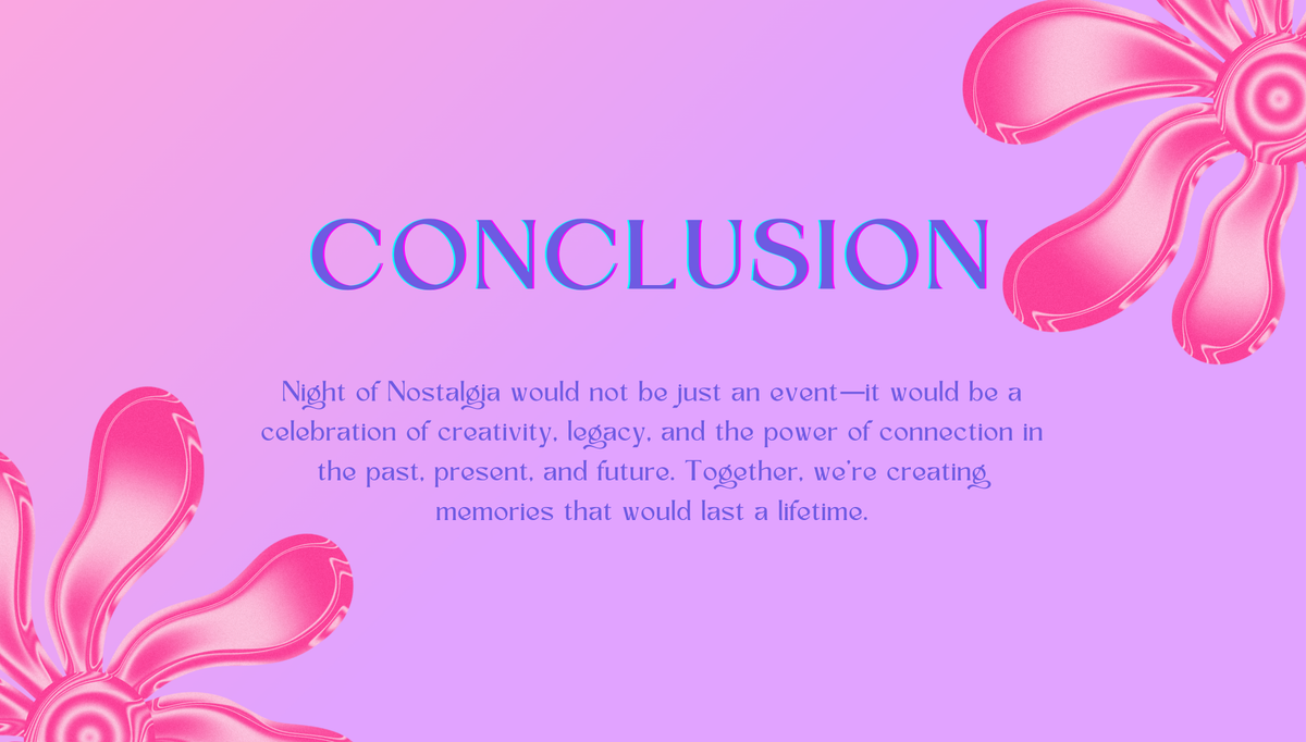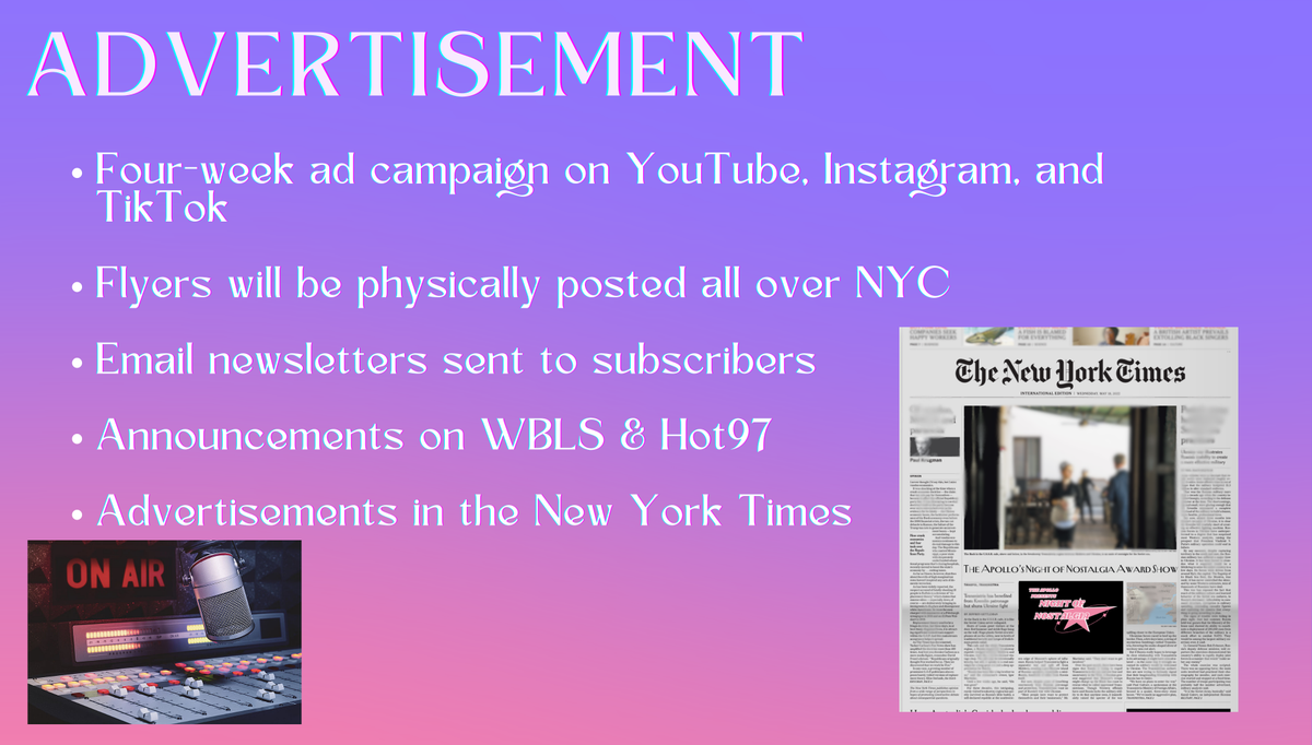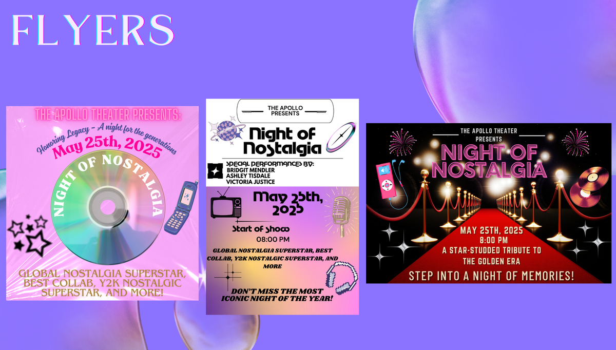 At Pace University, I took "Art & Entertainment Management," where we were assigned in groups to produce a mock event. I had volunteered to be the Project Manager of a group, and so I had led a group of 7 (including myself) to create "Night of Nostalgia!" Over a handful of months, we created the attached proposal (PDF) and created the presentation below to propose this event to our professor.